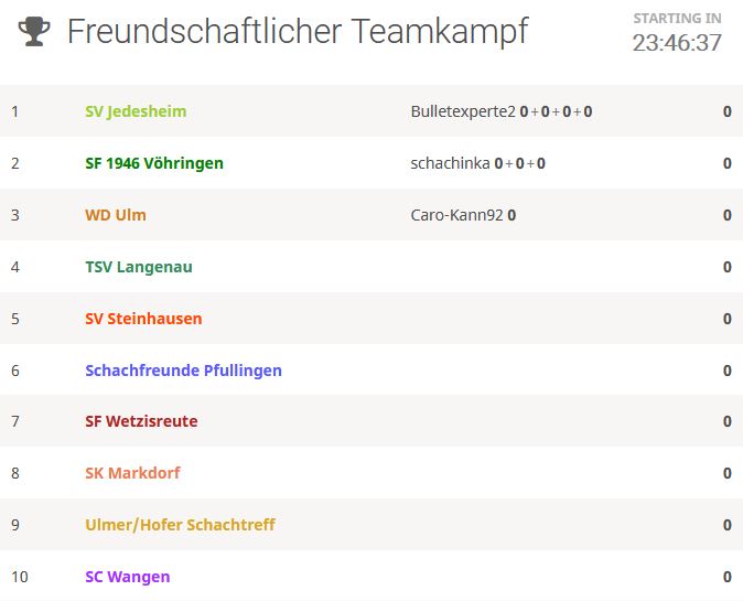 Am Donnerstag, den 11. Juni laden wir zu einem freundschaftlichen Team-Wettkampf ein. Wir spielen Blitzschach (3 min + 2 sec) von 20:00 bis 21:00 Uhr.