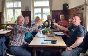 Anschließend wurde auf die Meisterschaft angestoßen: Norbert Grüner, Markus Eichhorn, Bernhard Jehle, Lars Kinzig, Armin Kranz, Carmelo Genduso, Markus Natter (v. l. n. r.). Die Kelembet-Brüder waren schon früh fertig und fuhren mit ihren Eltern zum Bodensee.