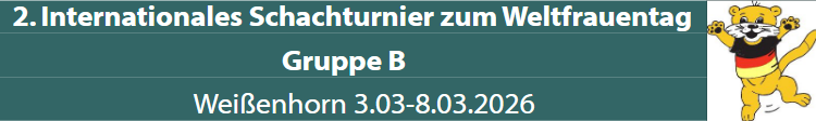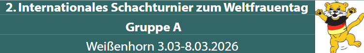 | Zeitplan Gruppe A: | 03.03. persönliche Registrierung 14:00 bis 15:00, 1. Runde 16:00 04.03. 2. Runde 10:00, 3. Runde 16:00 05.03. 4. Runde 10:00, 5. Runde 16:00 06.03. 6. Runde 16:00 07.03. 7. Runde 10:00, 8. Runde 16:00 08.03. 9. Runde 10:00, Siegerehrung um ca. 15:00 Championsdinner 19:00 |
