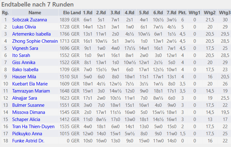 Auch in Gruppe B fiel die Entscheidung: Zuzanna Sobczak (GER) remisierte gegen Isabella Artemenko (GER) und gewann damit die Gruppe mit 6 Punkten aus 7 Partien.