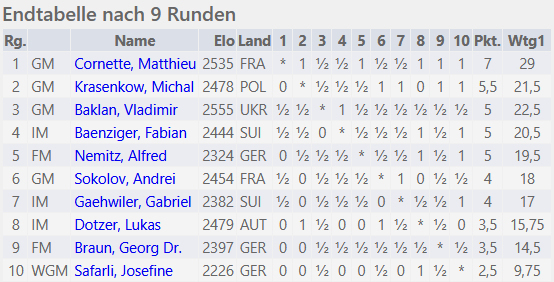 Im Viktor-Kortschnoi-Memorial hat sich die Situation an der Spitze noch einmal verändert. Nach einem fein herausgespielten Sieg gegen Dr. Georg Braun übernahm GM Matthieu Cornette (FRA) die alleinige Führung. Die Spannung bleibt jedoch bis zum Schluss erhalten: In der letzten Runde trifft Cornette direkt auf seinen Verfolger GM Michal Krasenkow (POL).