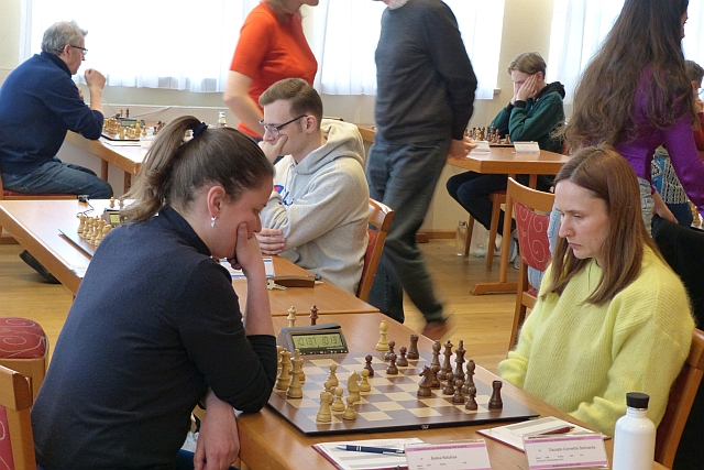 Im Frauenturnier – Gruppe A endete das Spitzenduell zwischen IM Klaudia Kulon (POL) und IM Deimantė Daulytė-Cornette (FRA) mit einem schnellen Remis. Dadurch konnte IM Nataliya Buksa (UKR) aufschließen: Sie gewann eine spannende und hart umkämpfte Partie gegen WGM Jana Schneider (GER).