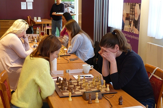 Im Frauenturnier (Gruppe A) liegen nach zwei Runden vier Spielerinnen mit voller Punktzahl an der Spitze. In der Nachmittagsrunde treffen sie direkt aufeinander: