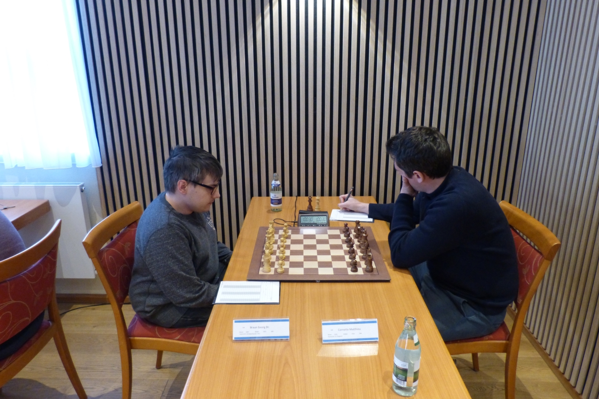 Diese Niederlage nutzte ein anderer Turnierfavorit: GM Matthieu Cornette (FRA) kämpfte mit offenem Visier, opferte kraftvoll eine Figur und gewann schließlich gegen den jungen FM Alfred Nemitz (GER). Damit schloss er zu Krasenkow an der Tabellenspitze auf.
