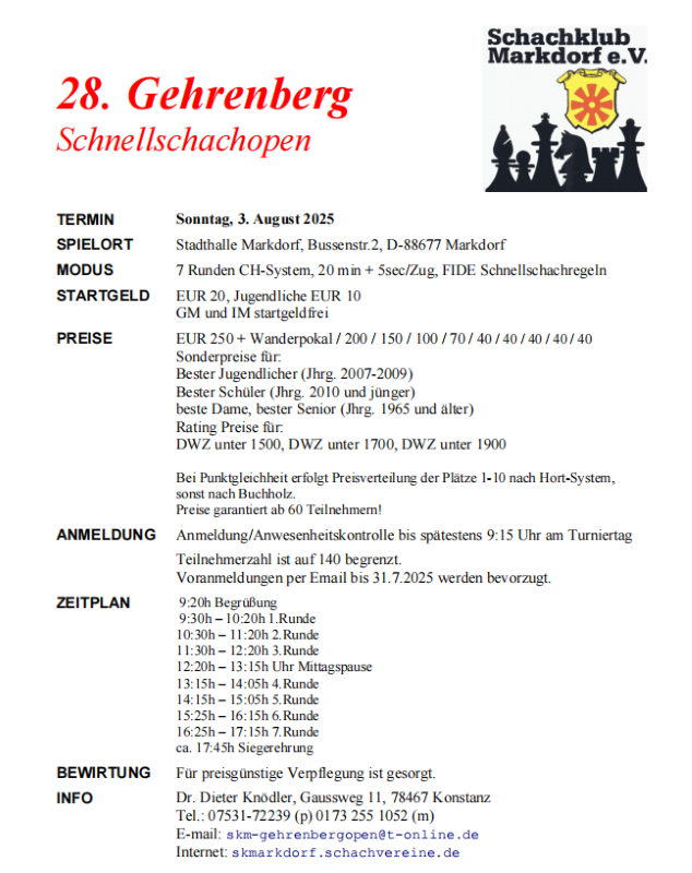 Der Schachklub Markdorf freut sich, Sie zu unserem 28.Gehrenberg Schnellschach Open am 3.8.2025 in Markdorf einladen zu dürfen.